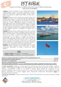 1° giorno: Partenza da Bologna con aereo Turkish Airlines diretto a Istanbul. All’arrivo incontro con la guida. Trasferimento in hotel e assegnazione delle camere. A seguire passeggiata a piazza Taksim e lungo la via pedonale di Istiklal caddesi. Rientro in hotel. Cena e pernottamento.
